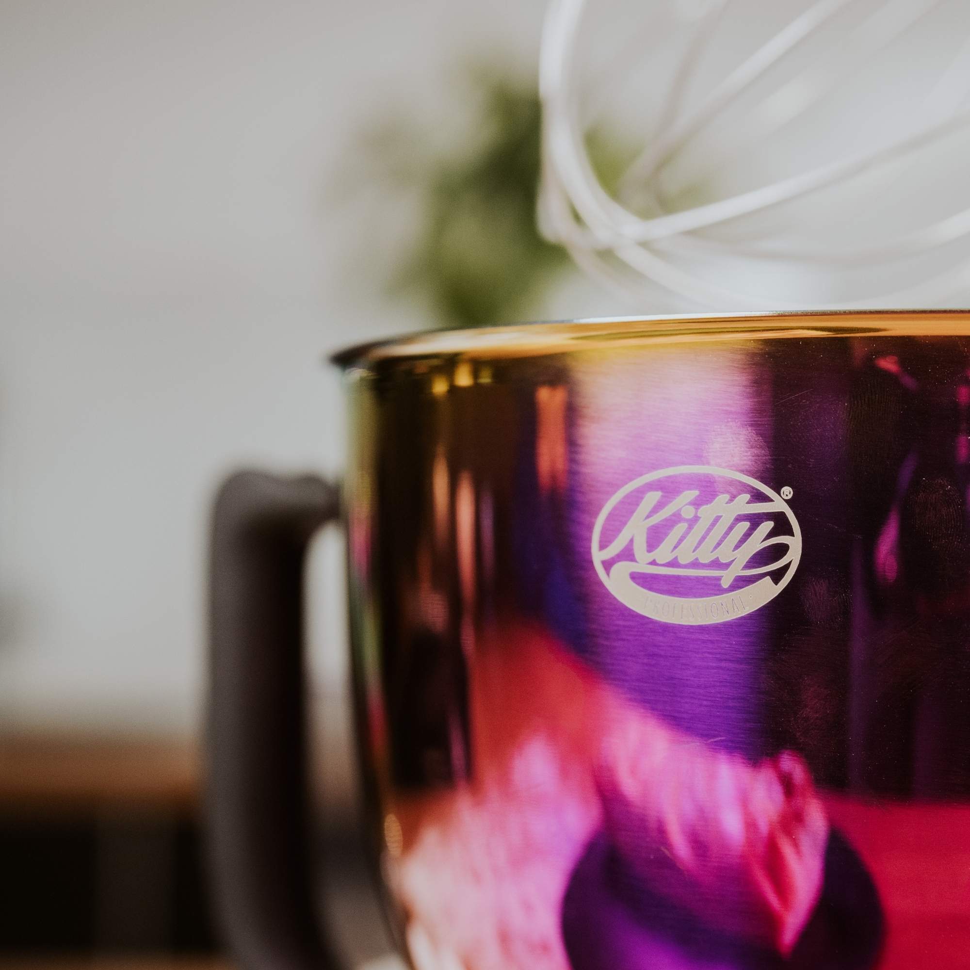 Entdecke die Rührschüssel, die mehr als nur ein Behälter ist. Die Kitty Professional Profi-Rührschüssel aus Edelstahl setzt neue Maßstäbe und ist kompatibel mit allen 4.3, 4.7 und 4.8 Liter KitchenAid* Küchenmaschinen mit kippbarem Motorkopf. Egal, ob du Teig knetest, Sahne schlägst oder andere Köstlichkeiten zauberst – diese Rührschüssel in der Farbe Sunrise bringt sie Farbe und gute Laune in deine Küche. Als Transportbehälter, Frischhaltebehälter und mehr hebt dieser Allrounder dein Küchenerlebnis auf ein neues Level.